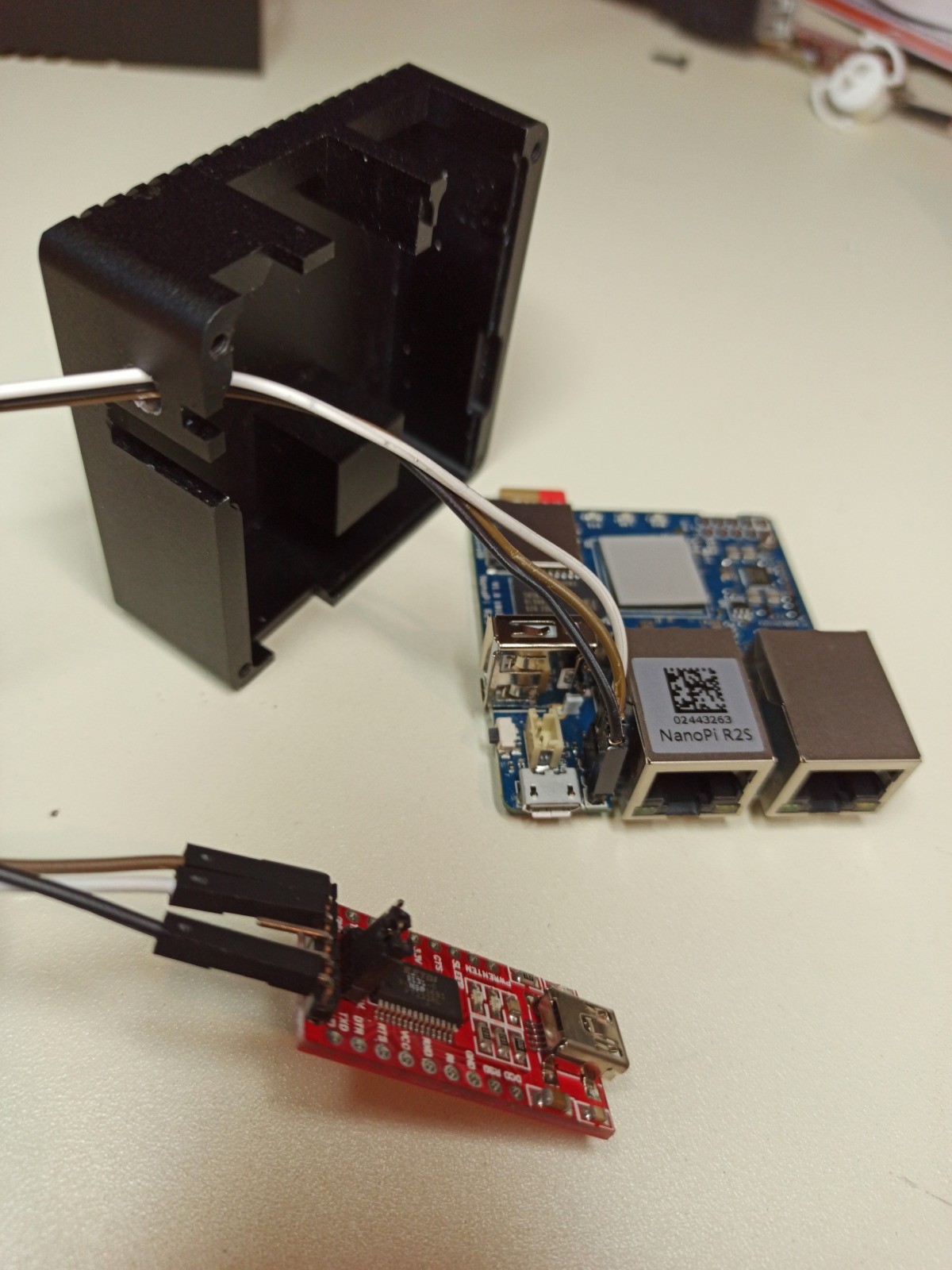 As you can see in the above image I’ve done a modification on the case by drilling a hole above the USB power connector. I’ve done this hole in order to be able to use the UART console while the case is closed.