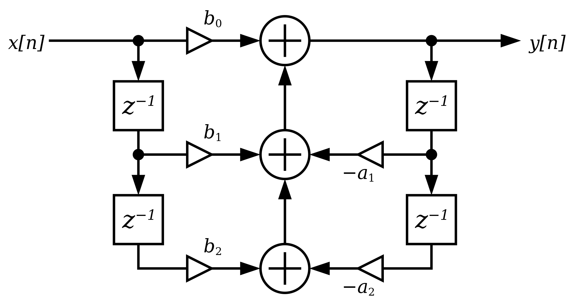 All the filters are based on the standard digital biquad filter (DBF), which is displayed here: