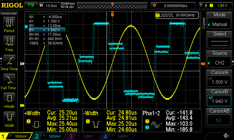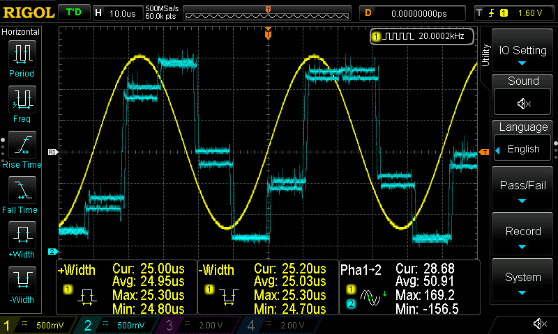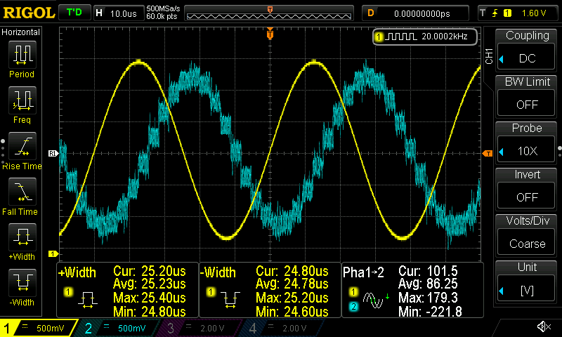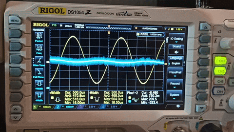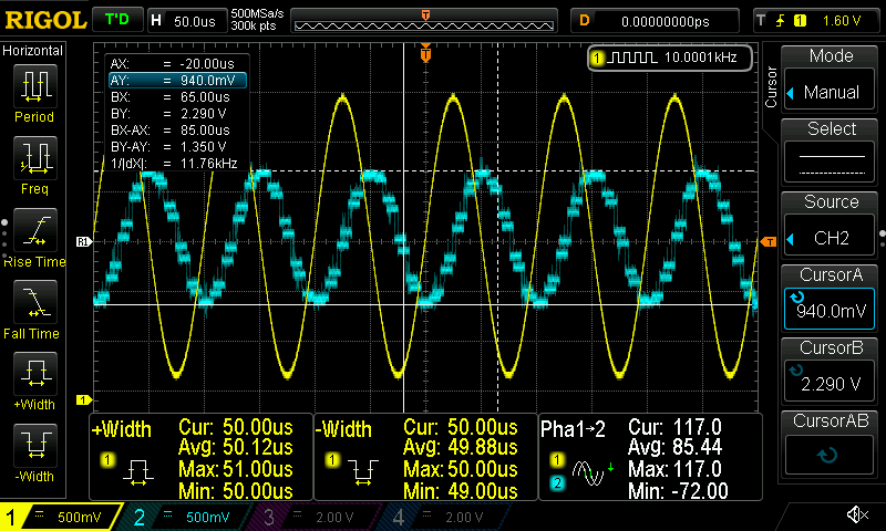 As you can guess, it’s expected to have a phase delay between the input and the output (ADC to DAC) as it needs time to sample, process and convert the input. From my tests this phase shift is around 25 degrees as you can see later in the screenshots, which is just a few micro-seconds.