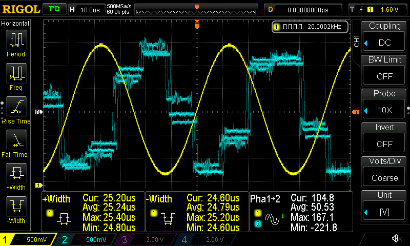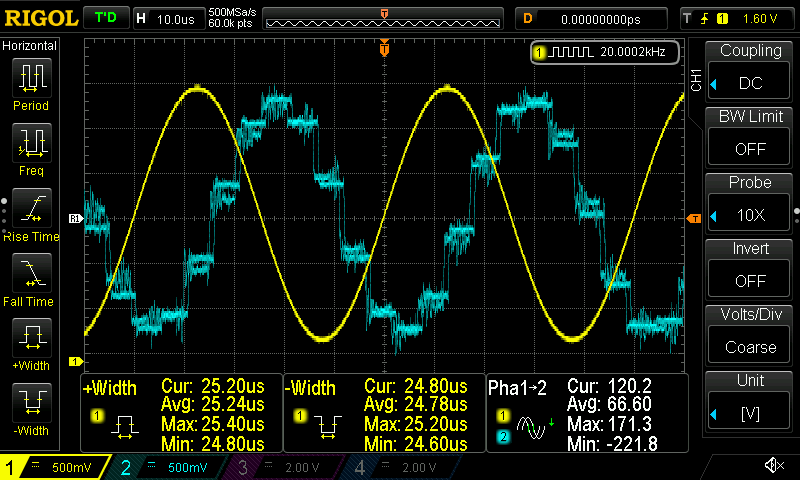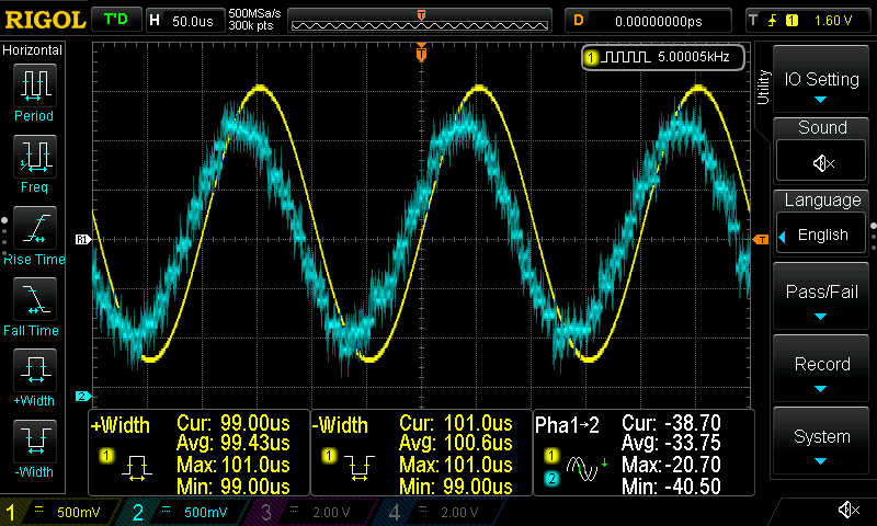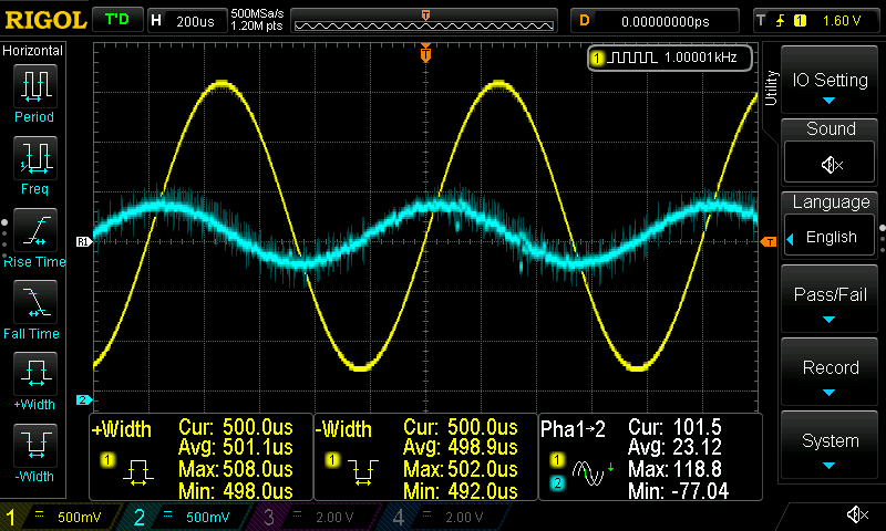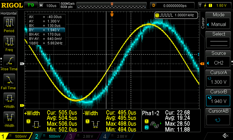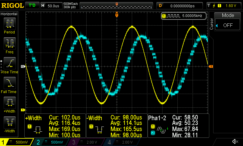 As you can guess, it’s expected to have a phase delay between the input and the output (ADC to DAC) as it needs time to sample, process and convert the input. From my tests this phase shift is around 25 degrees as you can see later in the screenshots, which is just a few micro-seconds.
