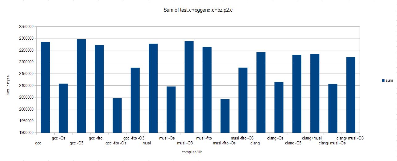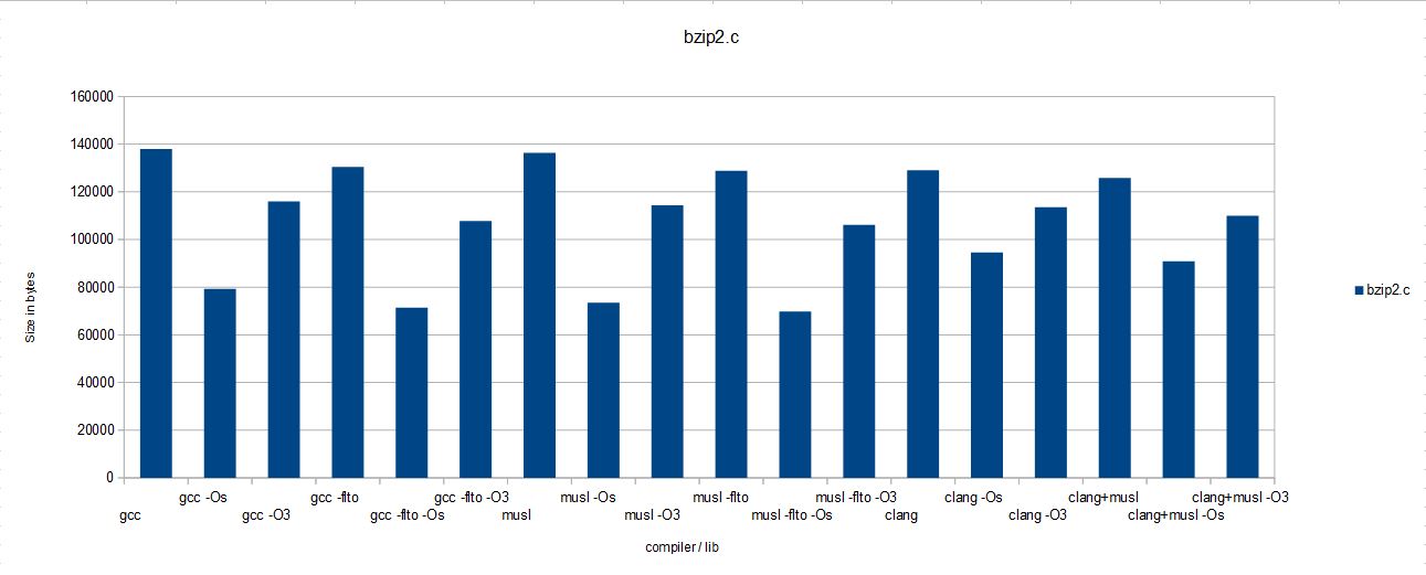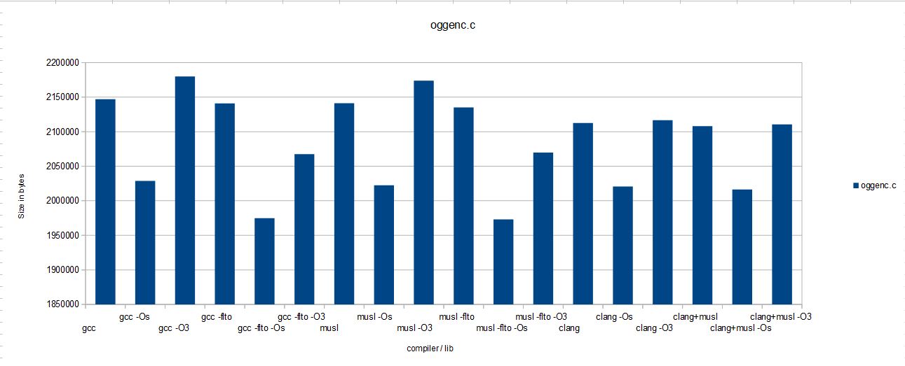 oggenc.cbenchmark shows that gcc+glib+LTO+Os and gcc+musl+LTO+O3 have the same performance and much smaller size compared to others benchmarks.bzip2.cshows that gcc+glib+LTO+Os, gcc+musl+Os and gcc+musl+LTO+Os perform the same and better that the rest.gcc.cfailed on musl and the gcc+glib+flto+Os performed better than the others.