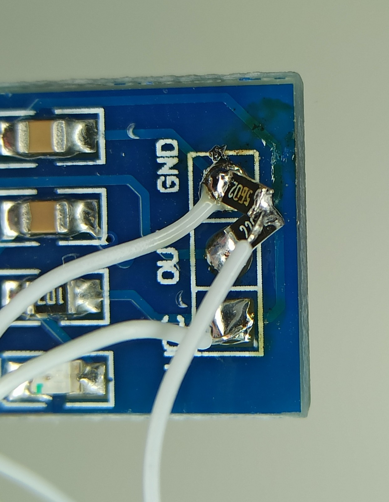 Next problem was that the ADC input on the ESP8266 is limited to a max 1V and the output of the ACS712 can be up to 3.5V (let’s assume 5V just to be sure in any case). Therefore, I’ve used a voltage divider on the output with a 220Ω and 56Ω resistors, which means at 5V I get 1.014V. For that I’ve used some 0805 1% SMD resistors and I’ve soldered them on the ACS712 PCB and I’ve solder a wire between them.