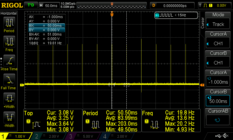 Again in the code I’ve used a sleep of 50ms and this time the oscilloscope shows that the average time between SPI packets is ~50ms (screenshots later on), which is a lot faster compared to the bash script. In the picture you see the average is 83, but that’s because sometimes there are some delays because of the OS like 200+ms, but that’s quite expected in a non PREEMPT-RT kernel. Also, I’ve noticed that there was no missing I2C packet with the executable. Nice!