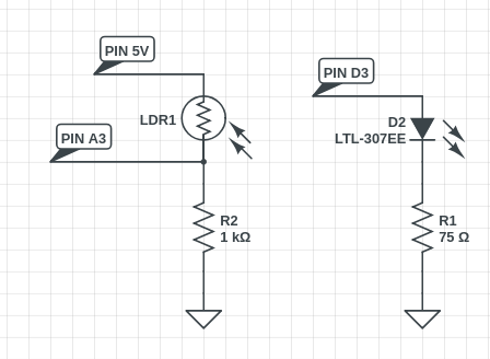 As you can see the D3 pin of the Arduino nano will be the PWM output that drives the LED and the A3 pin is the ADC input. In my case I’ve used a 75Ω resistor to drive the LED to increase the brightness range, but you might have to use a higher value. It’s better to use a LED that can handle a current near the maximum current output of the Arduino nano. The same goes for the resistor that creates a voltage divider with the photo-resistor; use a value that is correct for your components.