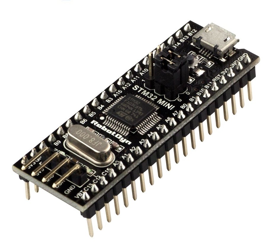 As I’ve said in this post I’ll use the STM32F303CC and specifically I’ll use the RobotDyn STM32-MINI (or black-pill) module. Well, don’t get confused, there are many different black-pill modules (some with an STM32F411, which I’ll use on a future stupid project). The one I’m using is this: