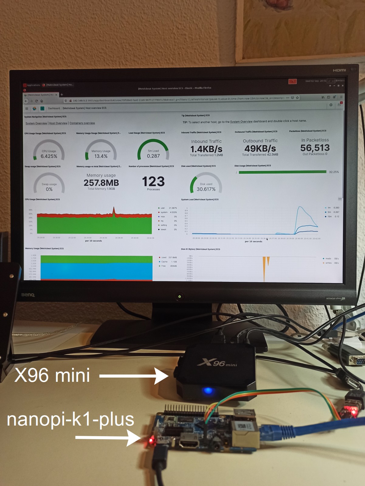 A neat little Linux box. Finally, I’ve used the nanopi-k1-plus with a custom Yocto Linux image using the meta-allwinner-hx BSP with the 5.8.5 kernel version. On the nanopi I’m running the metricbeat. Metricbeat is a client that collect system resources and performance data and then sends them to the Elasticsearch server.