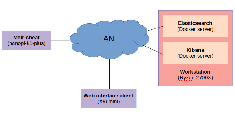 To test a new stack, framework or technology you need to start with a simple example and create a proof of concept. As a first example in this series I’ll run an Elasticsearch (ES) server and a Kibana instance on my workstation which will act as the main server. The ES will collect all the data and the Kibana instance will provide the front-end to visualize the data. Then I’ll use an SBC and specifically the nanopi-k1-plus, which is my reference board to test my meta-allwinner-hx BSP layer. The SBC will run a Beat that collects metric data from the running OS and sends them to the Elasticsearch server. This is the system overview: