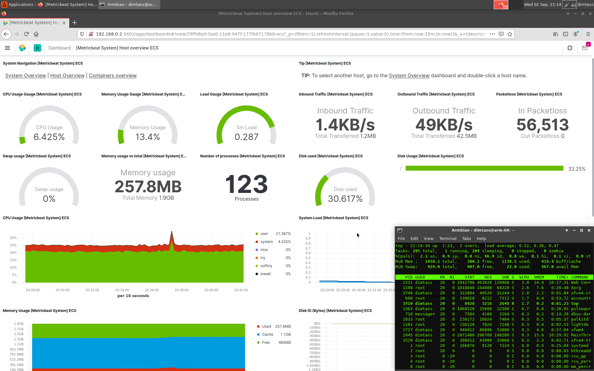 Now, if you wait for a bit then the server will start receiving metric data from the SBC. In order to view your data you need to open the Kibana web interface app into your browser. I’ve tried this on both my workstation and the X96mini in order to compare the performance. On my workstation it takes a couple of seconds to load the interface, but on the X96mini it took around 1.5-2 minutes to load! Yep, that means that the user interface is resource demanding, which is a bit unfortunate as it would be nice to have an option for a lighter web interface (maybe there is and I’m not aware of it).