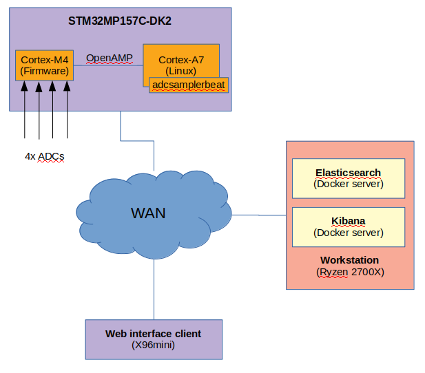 I’ve used the CM4 to sample 4x ADC channels using DMA and double buffering and then OpenAMP to send the buffers from the CM4 to the CA7 and the Linux user-space. Then the custom adcsamplerbeat elastic beat module published the ADC sampling data to the Elasticsearch server and finally I’ve used the Kibana web interface to create a dashboard and visualize the data.