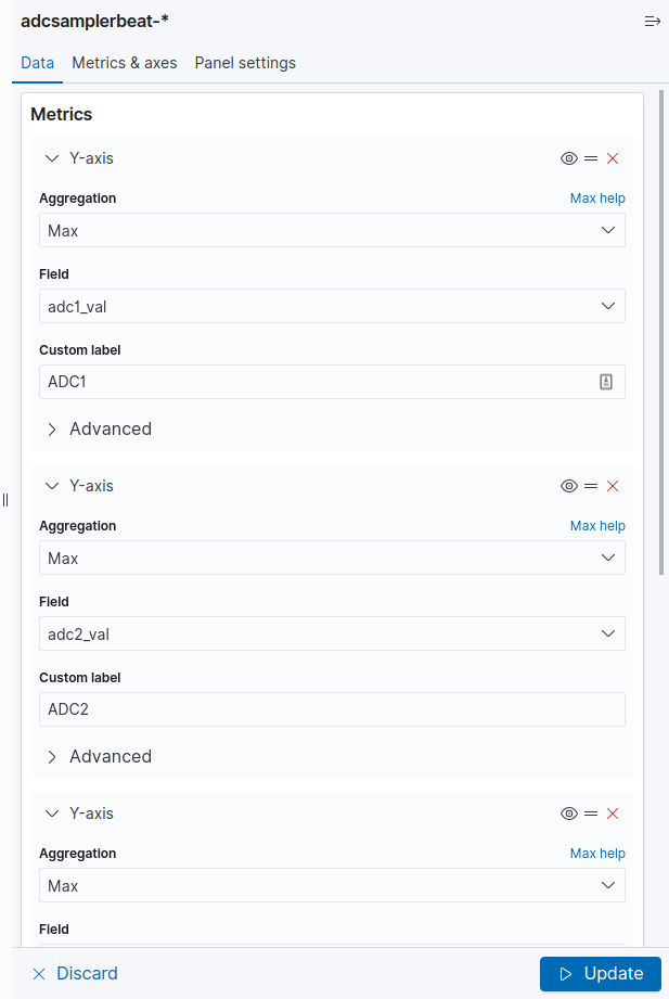 Ignore any other indexes and just select adcsamplerbeat-* then in the next screen you need to add a Y-axis for every ADC value and also use the following configuration for each axis